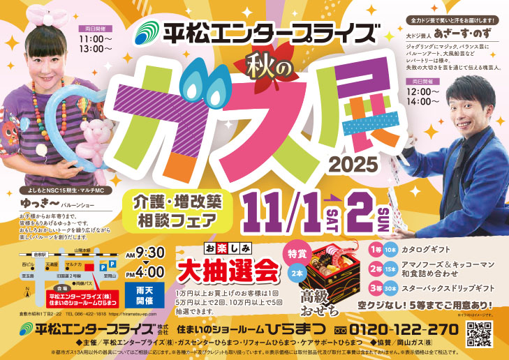 弊社では「秋のガス展~介護・増改築相談フェア」を11月1日(土)・2日(日)の2日間開催いたします。 便利で快適、そのうえ家計にも優しい住宅機器が2日間限りの大・・・